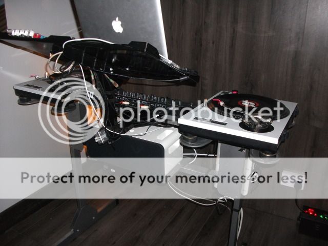 I wanted the set up to be tight and not to sprawled out so had to think about putting stuff at differnet hights to to make the table as small as possible. So I picked up a Sefour CDJ stand on ebay cheap and added a bit of alloy to make a midifighter stand. It works great and really sets the midifighters at the ideal hight for me.