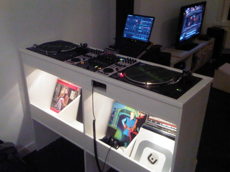 The key to having it accepted was to buy my GF some records and give her her own section in the record holders below. Believe me when I say it hurts a bit when your professional DJ stuff, painstakingly layed out to drop the sickest beats is used to play ABBA or Grease, but its worth it!