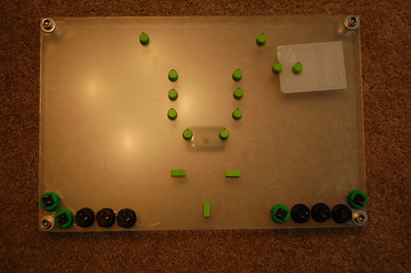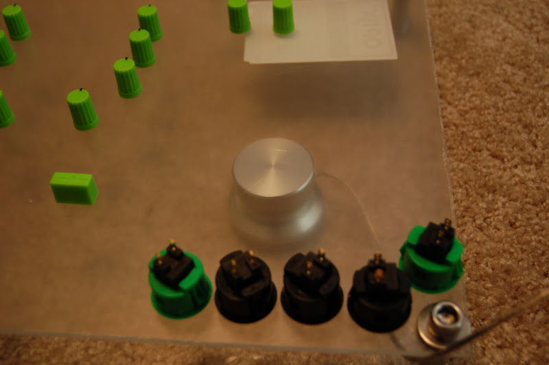Eyeballing a potential layout for the controls. The two that are spaced wide at the top will be Master and Headphone vol/gain. They are spaced to provide a place for one of the components I have not gotten my hands on yet. You can also see the UHID board under the top panel, just below center.