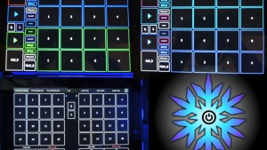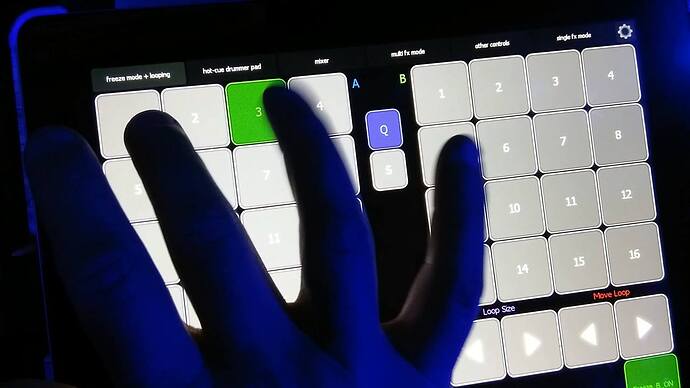 I also have a *FREE mapping I made for DJs who use Traktor… Giant touch-screen control over hatches (jam them like drum pads without “setting” any new hatches as you play), headphone cues, play/pause buttons, sync on/off, BPM double/half/reset, asking master tempo, sync/quantize, and flux mode on/off for all 4 decks, plus a page with dropping “freeze mode” loops where you can adjust the loop size, move it forward or back, or instantly play any of the 16 loop segments instantly like a drum pad! So, it requires an iPad with Liine’s Lemur app, then I have the free Traktor .tsi file and dLemur .jzml file, all using midi channel 1 on the iPad/Lemur Daemon. I use mine hard wired with iPad USB cable, and can show pics of the settings for everything, but here is what it looks like…