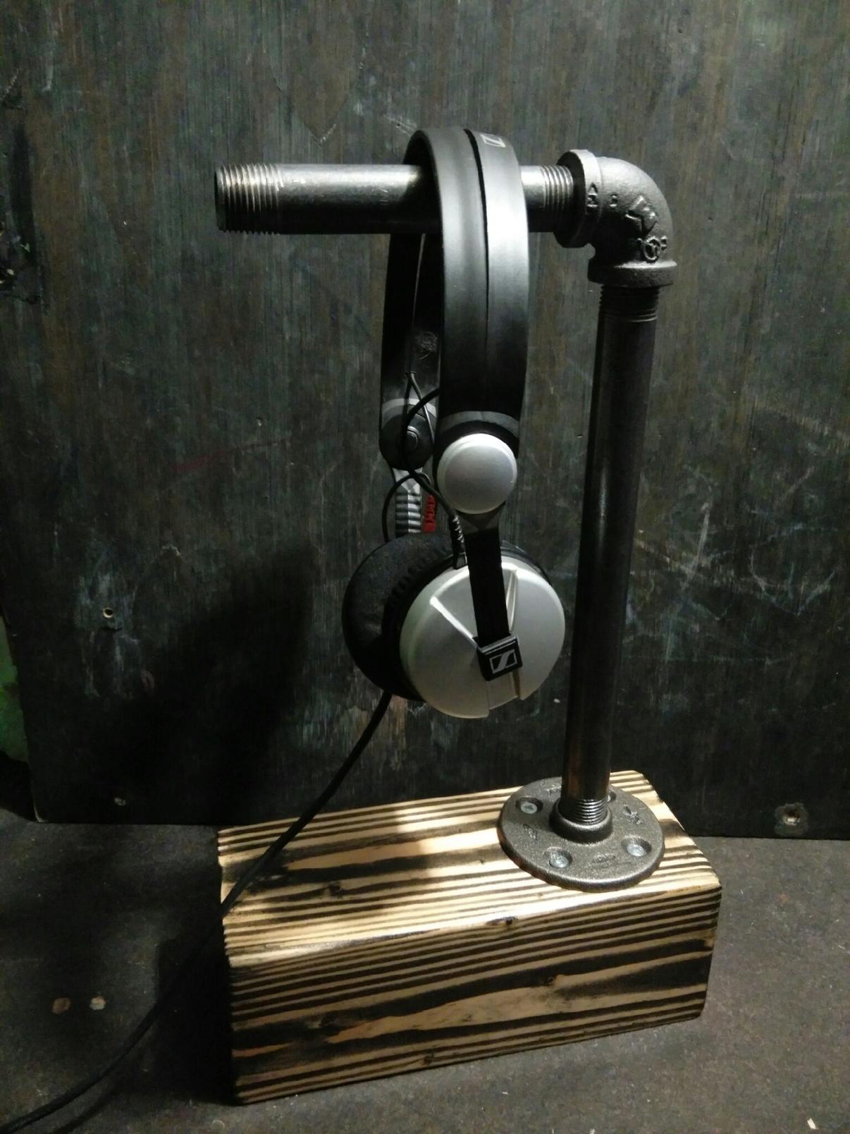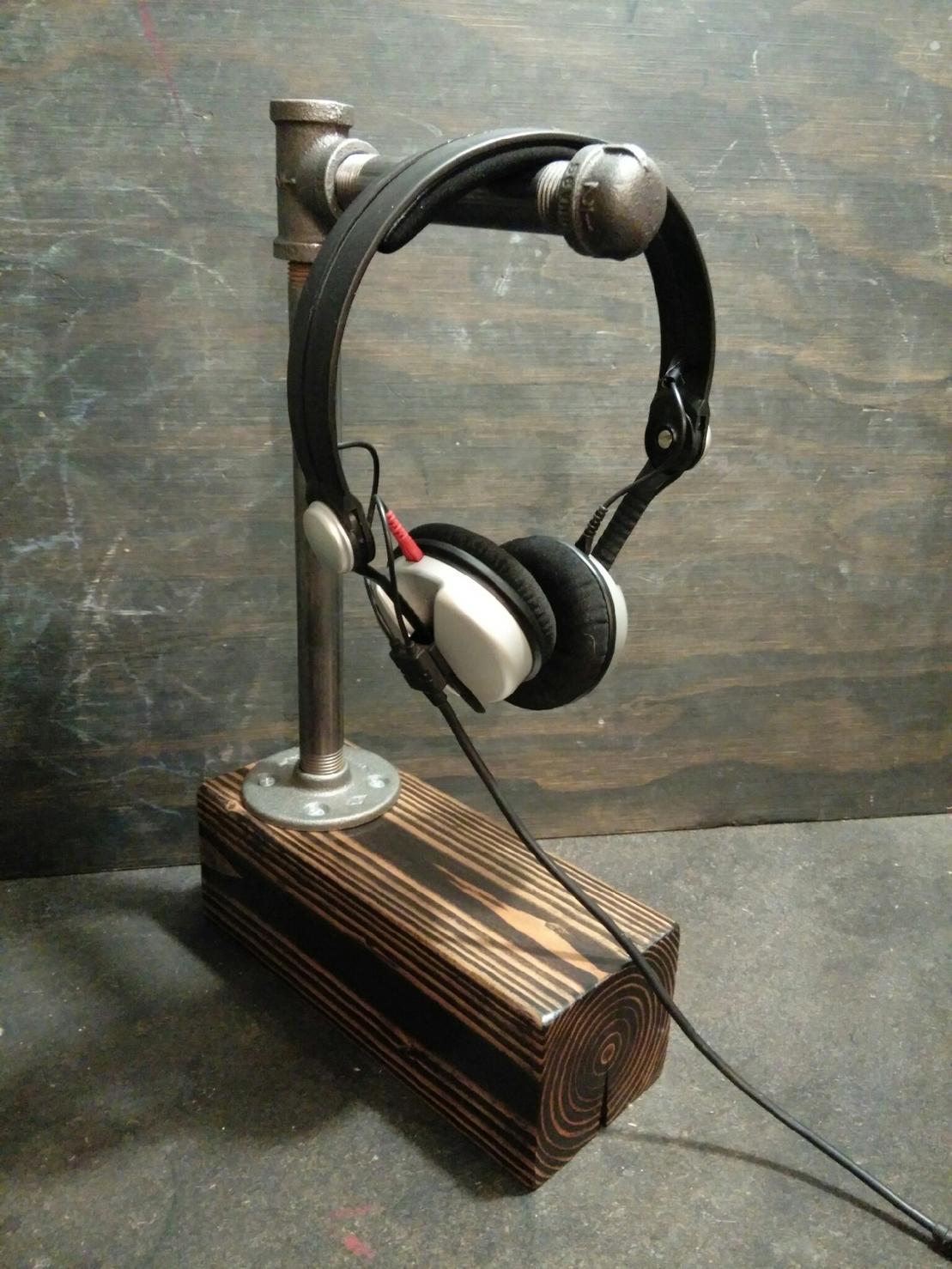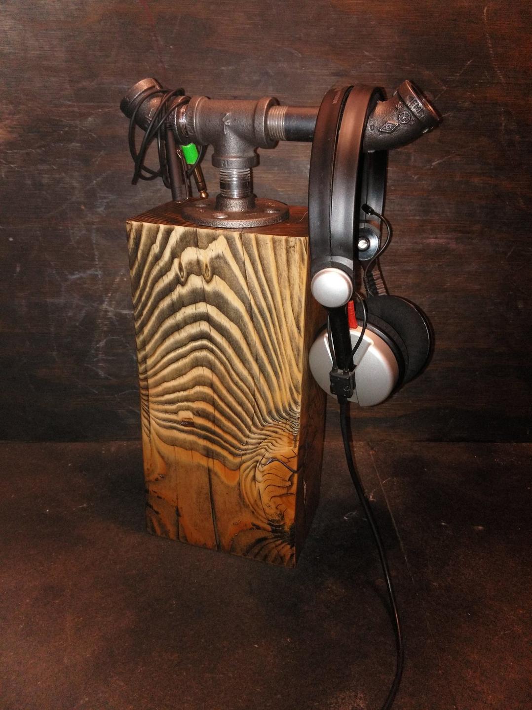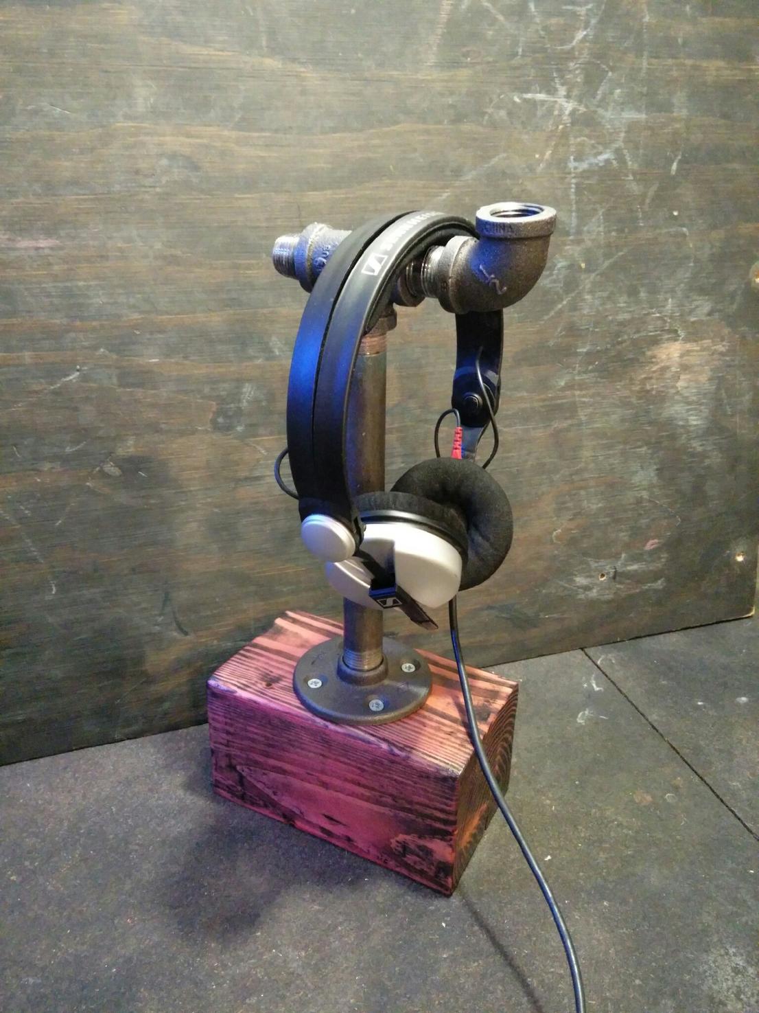 I make 1-of-a-kind headphone stands with stained wood, rock, industrial pipe