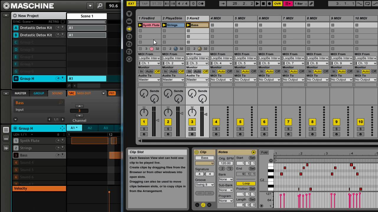 This video shows a good example on how to combine Maschine with Ableton and get the best of both.