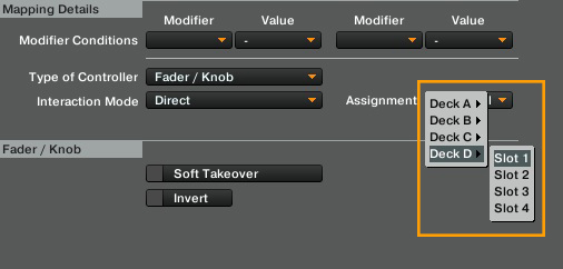 Second, there is a modifier condition called “Sample Page Selector” which tells Traktor which Page is currently in use. For example, one button on you controller will have a control over one sample cell in each of the sample pages (cell 1 trigger, cell 5 trigger, cell 9 trigger and cell 13 trigger)