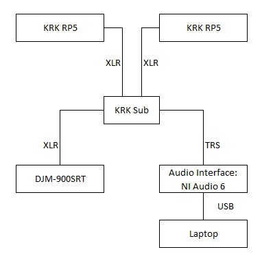 I thought by using this setup, the sub would filter which system (DJ or production) to output based on which one was providing an output. However, in practice that hasn’t shown to be through and the TRS (production) setup seems to take priority.