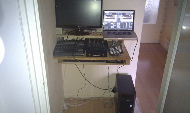 I decided to redo my square meter by building this DIY desk. On which I could place my MacBookPro, Audio4DJ, BCR2000 and MIDIfighter.
