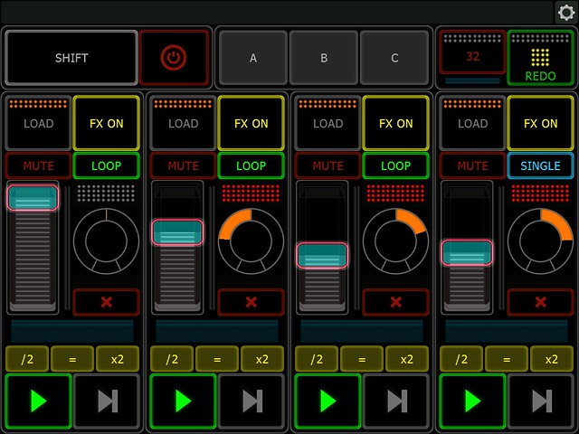 3.b. Play – press to play the recorded loop; virtual leds on top will light up green when playing; virtual leds in the middle will light up yellow when there is a recording; a message will be displayed at the bottom if Undo/Redo is possible; Shift + Play – deletes the recording.