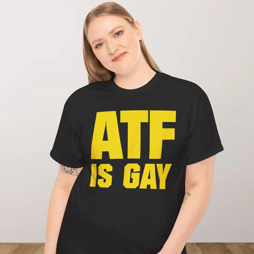 The ATF is Gay T Shirt features large bold text across the back, with a straightforward message. The letters “ATF” denoting the law enforcement agency are enlarged, with “Is Gay” presented just below in slightly smaller font. The simplicity amplifies the statement.