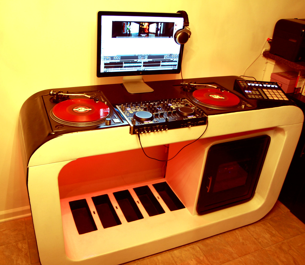 The top includes two original black technics 1200, a denon mc 6000, and the maschine all wrapped up with an audio 8 inside.