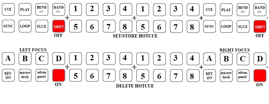 -First encoder row is dedicated for 3 band EQ knobs and Key adjust regards to focused deck. How to apply effect to EQ? - Simple, just turn any EQ knob over 12 o’clock and LED will lite up to indicate that Isolator is engaged for selected frequency (rmx-1000 replicate). Basically, when any of frequency isolators are engaged current track deck EQ kill become on and the same EQ at duplicated deck become off and ready for effect to be applied.