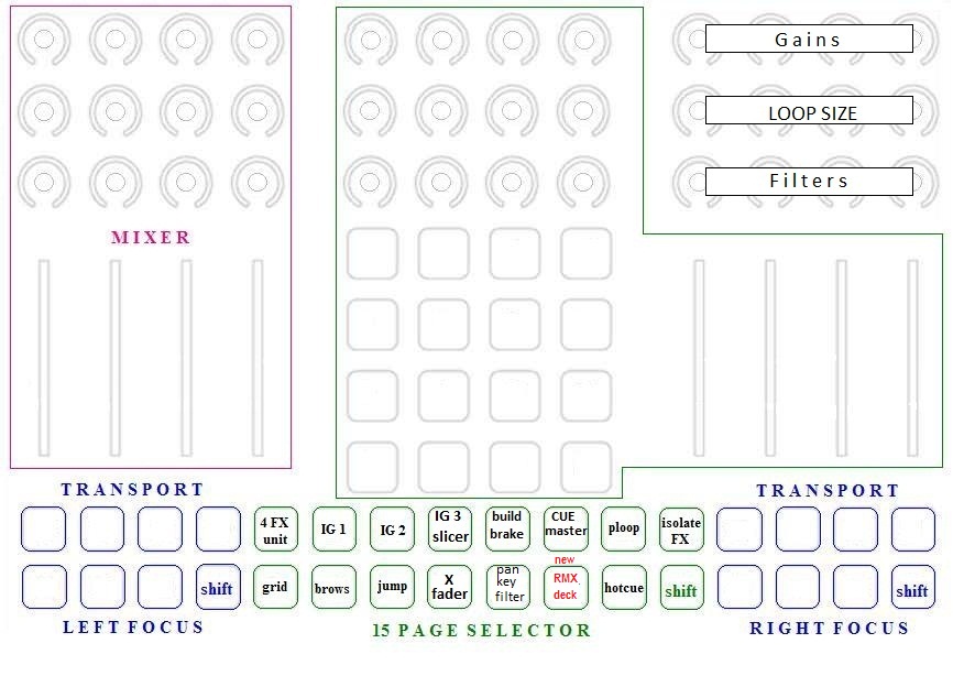 This is a bank for all those who aren’t comfort with my double deck focuses and here you’ll find not all but the most of transport controls all in one page and for all four decks. There is also a second layer via shift button where besides master deck and loop set you can set loop in and out points as well. Since the leak of balance, key adjust and filter on/off button I managed to include it all here ![]()
