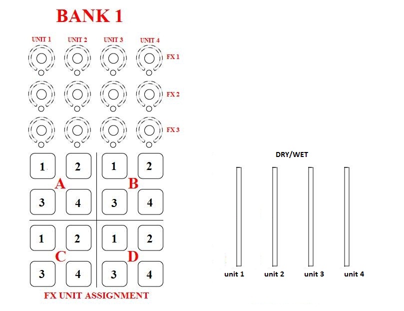 In this bank there are eight different presets that loads a various combos of effects - three FXs in unit 2 and one effect in unit 4. Pressing any of this eight pads will directly engage all related effects and set both dry/wet levels to 0% and last two faders in right are maped for wet/dry signal and unit 4 effect rate. What’s important to say is that dry/wet fader should be in down position before switching to other preset in this bank in order for build to be efectively used. I’m not gonna say which effects are loaded in each preset - that’s up to you to explore ![]()