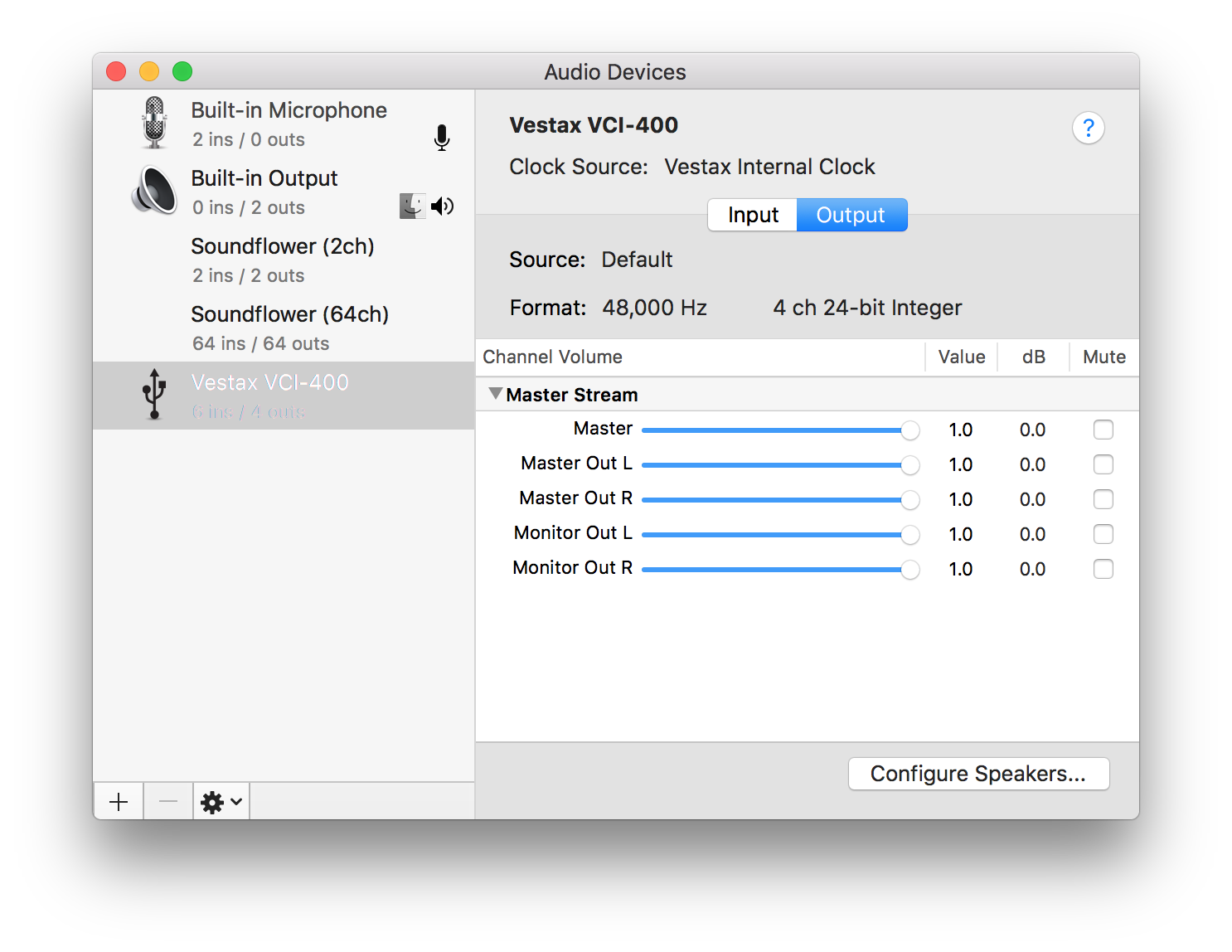 Go to “Applications/Utilities/Audio MIDI App” If you can’t see the Audio window press CMD + 1 on your keyboard. Finally select your VCI from the list and make sure all faders are at 1 on the OUTPUT tab.